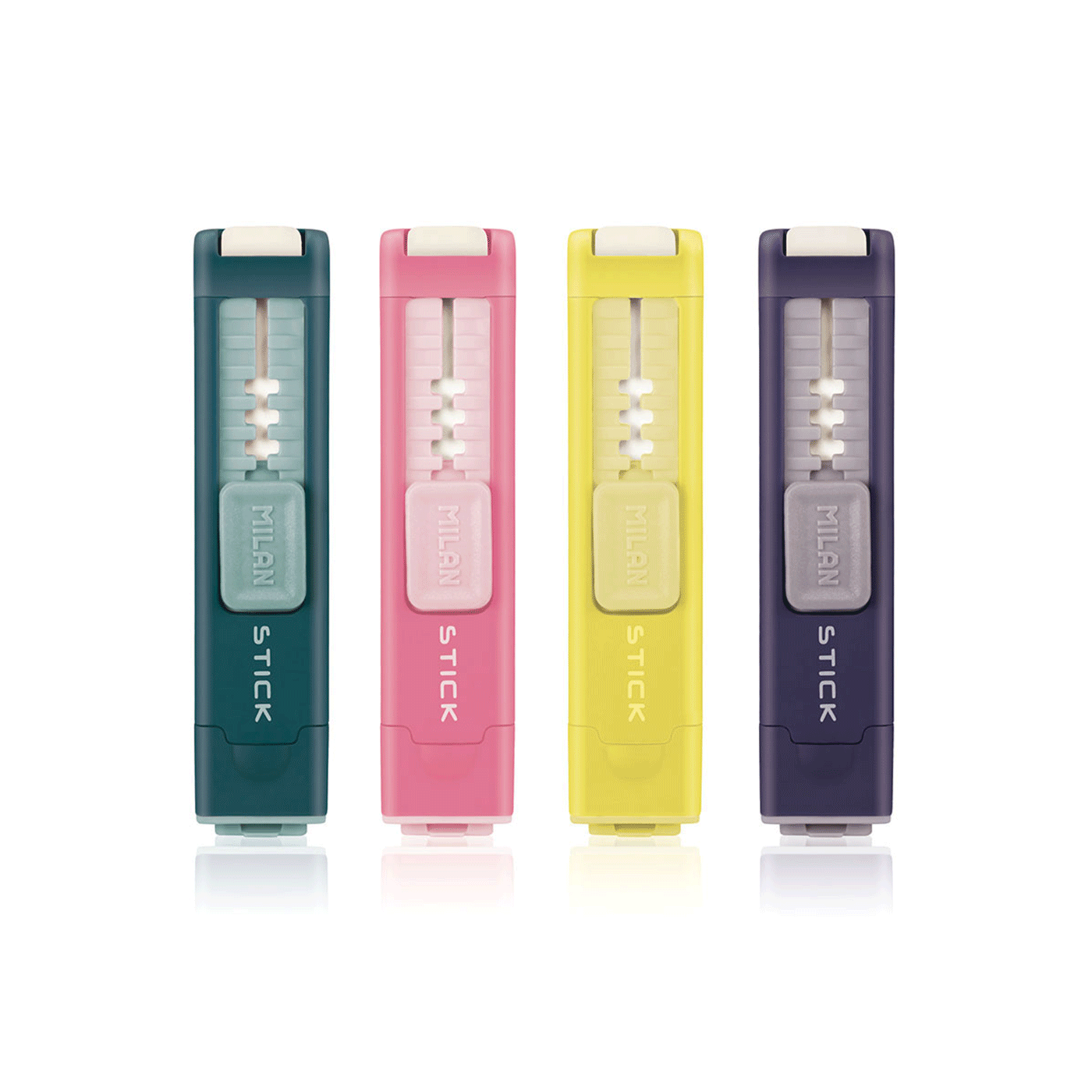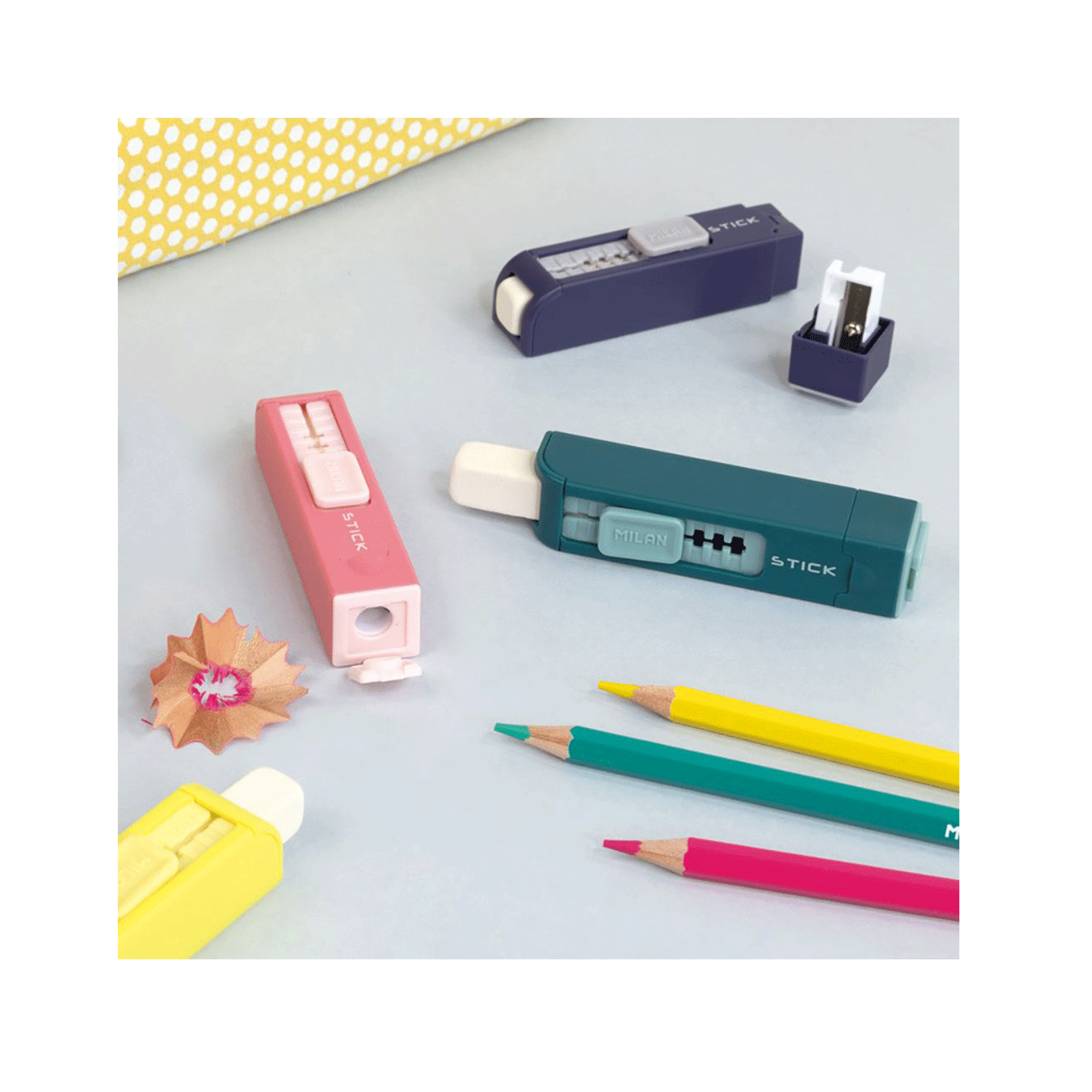 - Kombinacija gumice i šiljila sa spremnikom. STICK dizajn. Duguljasta pravokutna gumica. Šiljilo ima oštru i izdržljivu čeličnu oštricu, što ga čini prikladnim za sve vrste olovaka. Sigurnosni sustav sprječava odvajanje oštrice od tijela šiljila. Dostupno u 4 boje: žuta, ljubičasta, roza i zelena.
