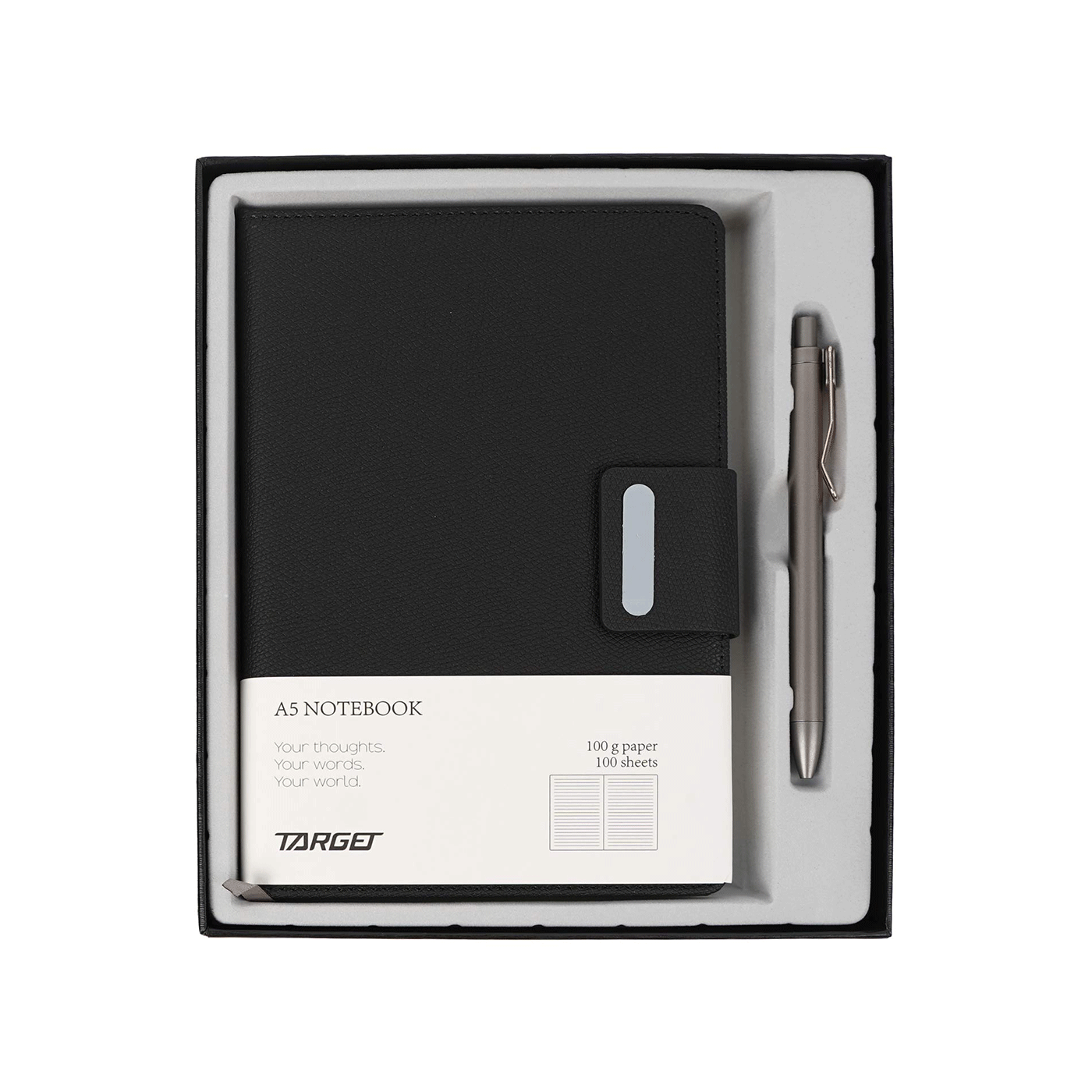 Poklon set u kutiji Rokovnik A5 s olovkom i kopčom crni Target – presvučen umjetnom kožom