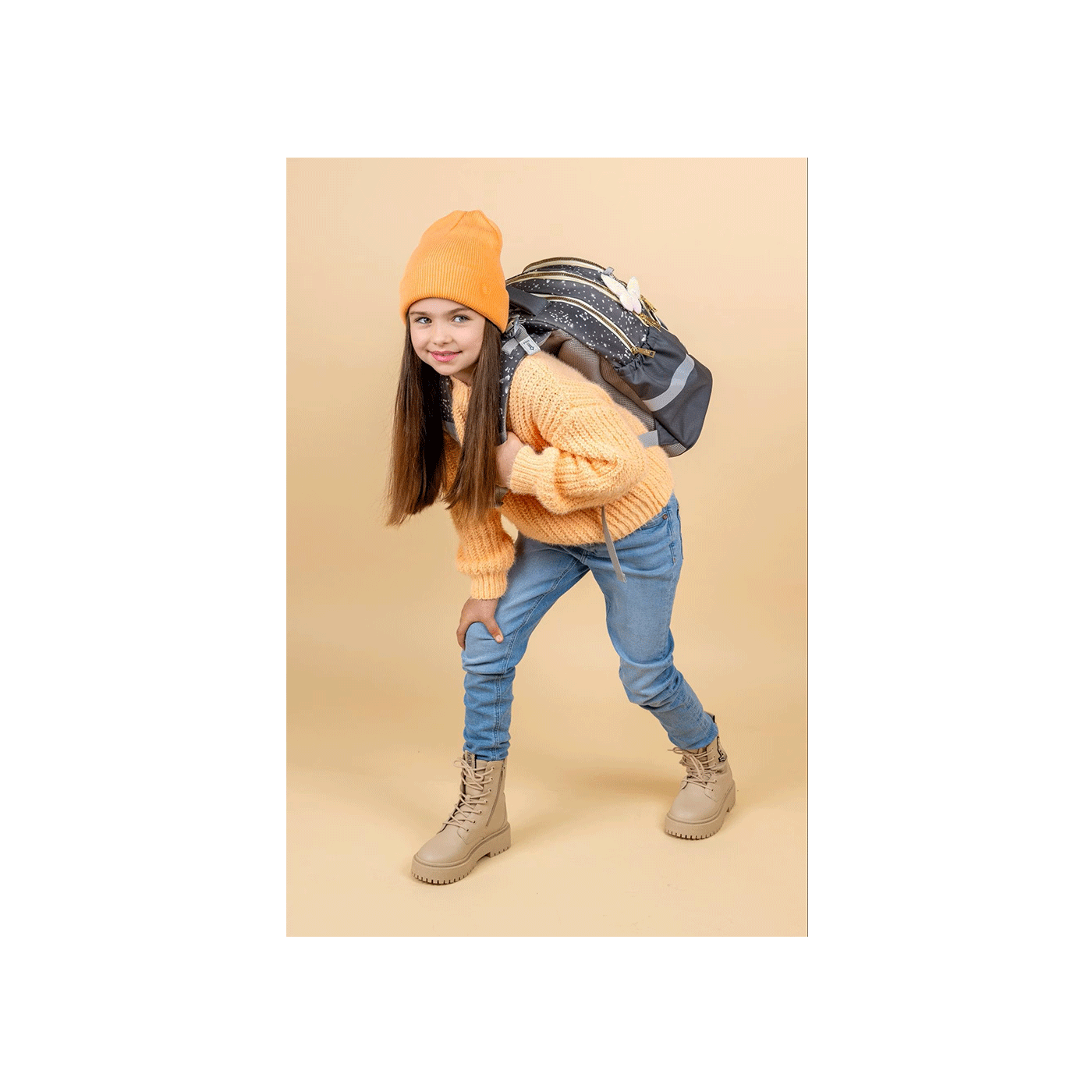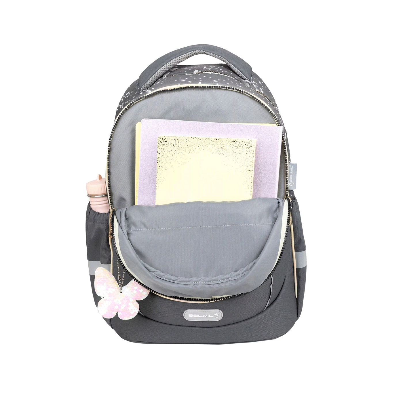 S Belmil školskim ruksakom sigurnost je zajamčena čak i kada padne mrak: pažljivo postavljene reflektirajuće trake sa svih strana, čvrsta i metalna kopča s reflektirajućom značajkom osiguravaju dobru vidljivost noću.