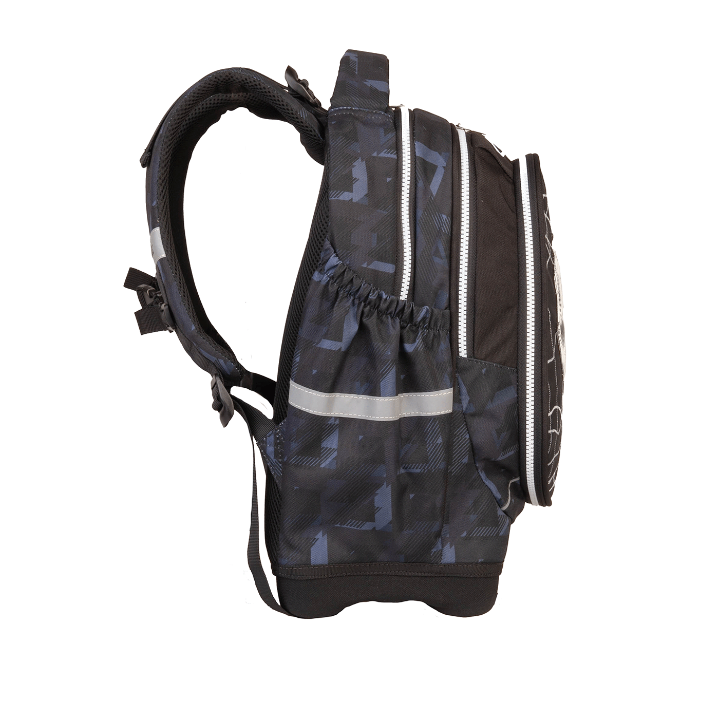 Ergonomski oblikovan leđni dio omogućava protok zraka. Anatomski oblikovane široke naramenice ; remenčići za podešavanje; tvrda podnica, koja kod nošenja čuva knjige od oštećenja; snažno reflektirajući, sigurnosni dijelovi; izrađen je od materijala koji odbija vodu; veliki pretinci za knjige; pretinci na bočnim stranama za bočicu.