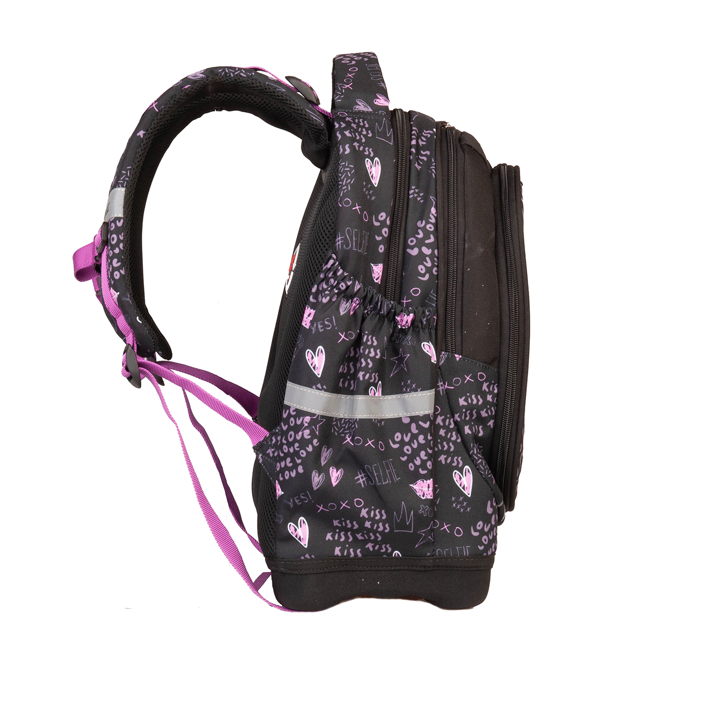 Ergonomski oblikovan leđni dio omogućava protok zraka. Anatomski oblikovane široke naramenice ; remenčići za podešavanje; tvrda podnica, koja kod nošenja čuva knjige od oštećenja; snažno reflektirajući, sigurnosni dijelovi; izrađen je od materijala koji odbija vodu; veliki pretinci za knjige; pretinci na bočnim stranama za bočicu.