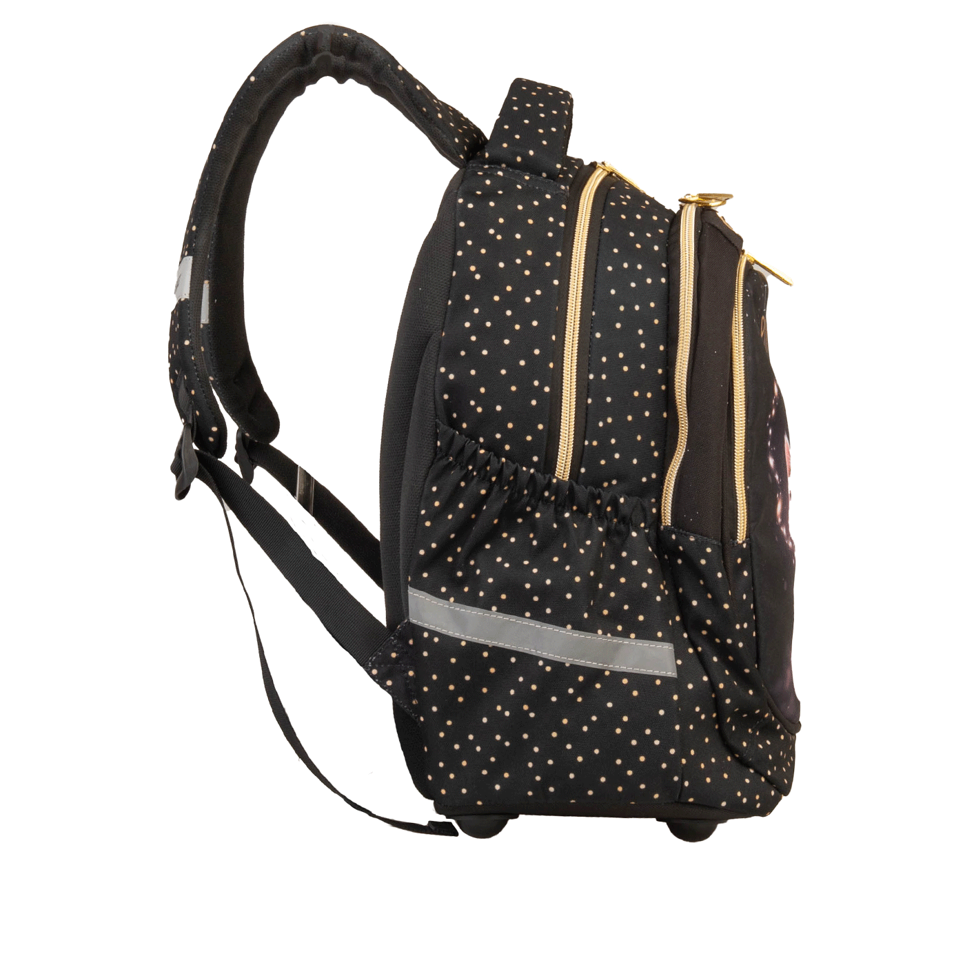 Ergonomski oblikovan leđni dio omogućava protok zraka. Anatomski oblikovane široke naramenice; remenčići za podešavanje; snažno reflektirajući, sigurnosni dijelovi; izrađen je od materijala koji odbija vodu; veliki pretinci za knjige; pretinci na bočnim stranama za bočicu.
