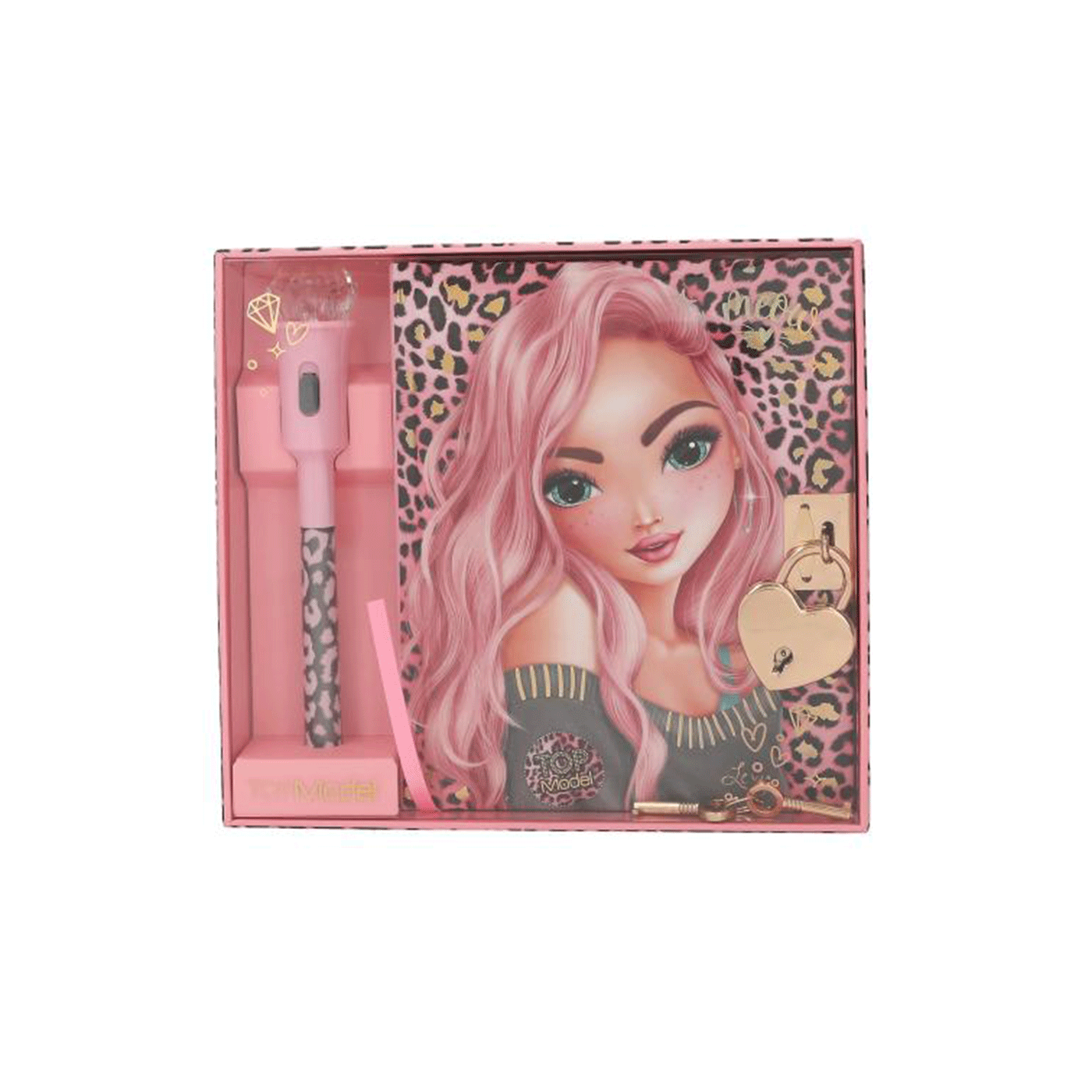 TOPModel set za tajne misli i tajne: Dnevnik u šarenom leo izgledu s cool motivom modela ima bravu u obliku srca s dva ključa ,stranice sa crtama.. Posebna olovka piše nevidljivom tintom koja postaje vidljiva tek kada je osvijetljena UV svjetlom na dijamantnom vrhu. Baterije u olovci su zamjenjive.