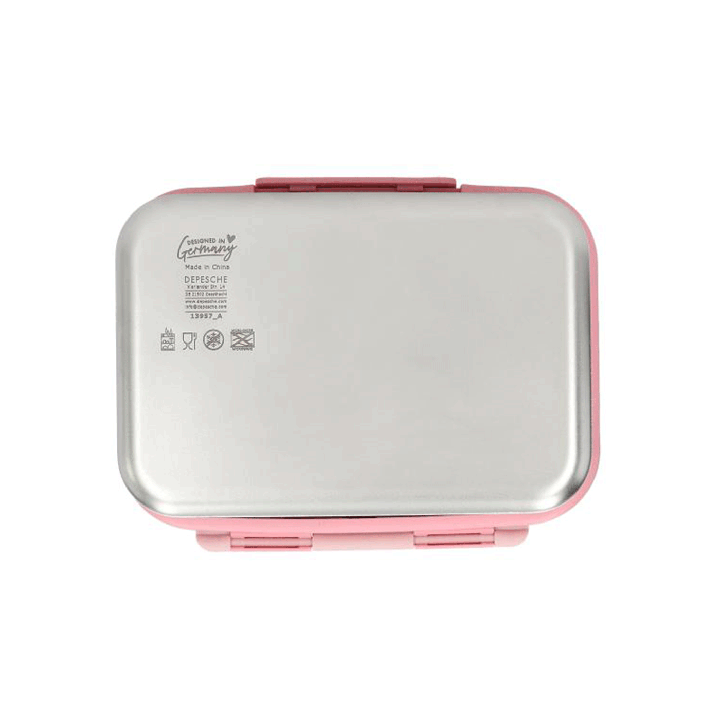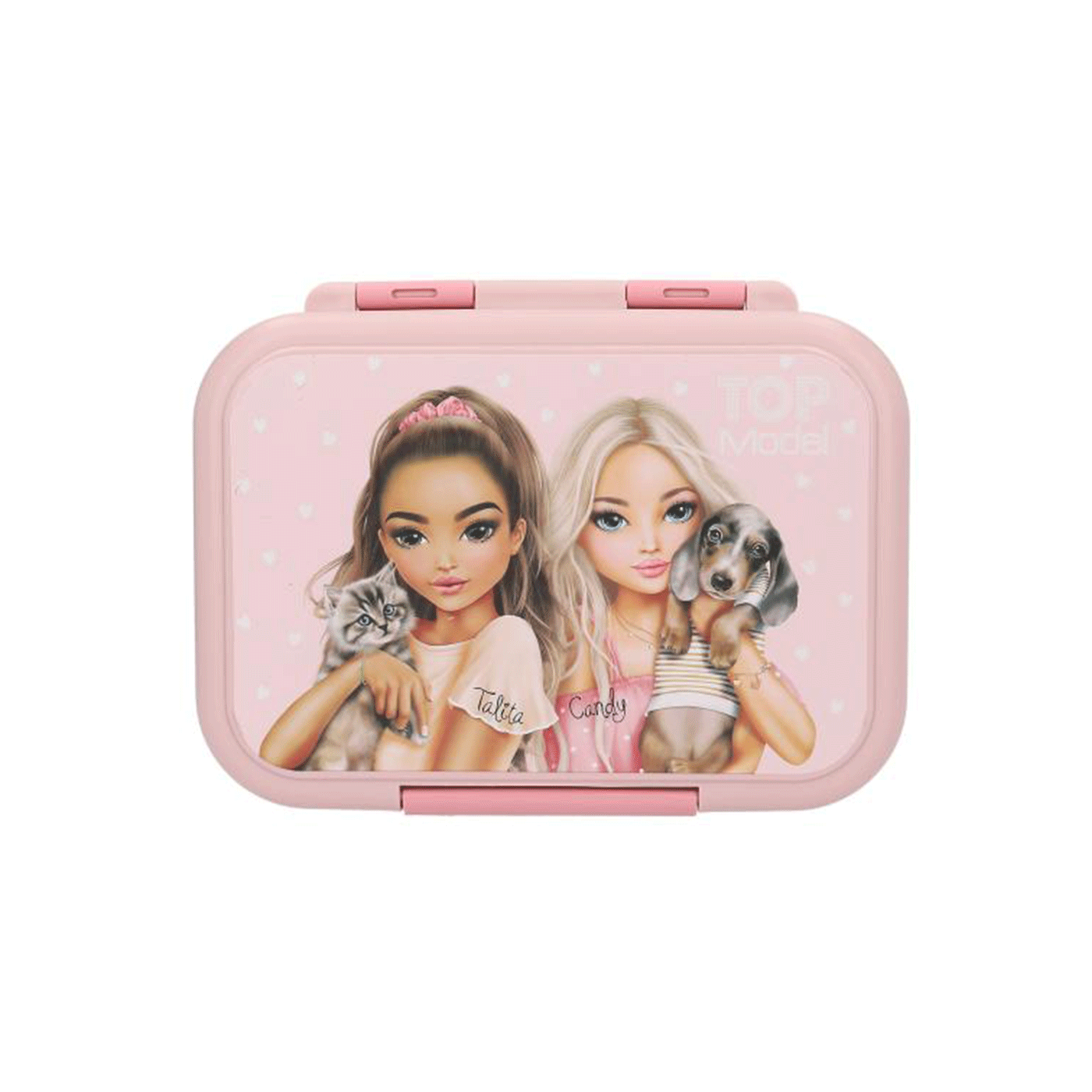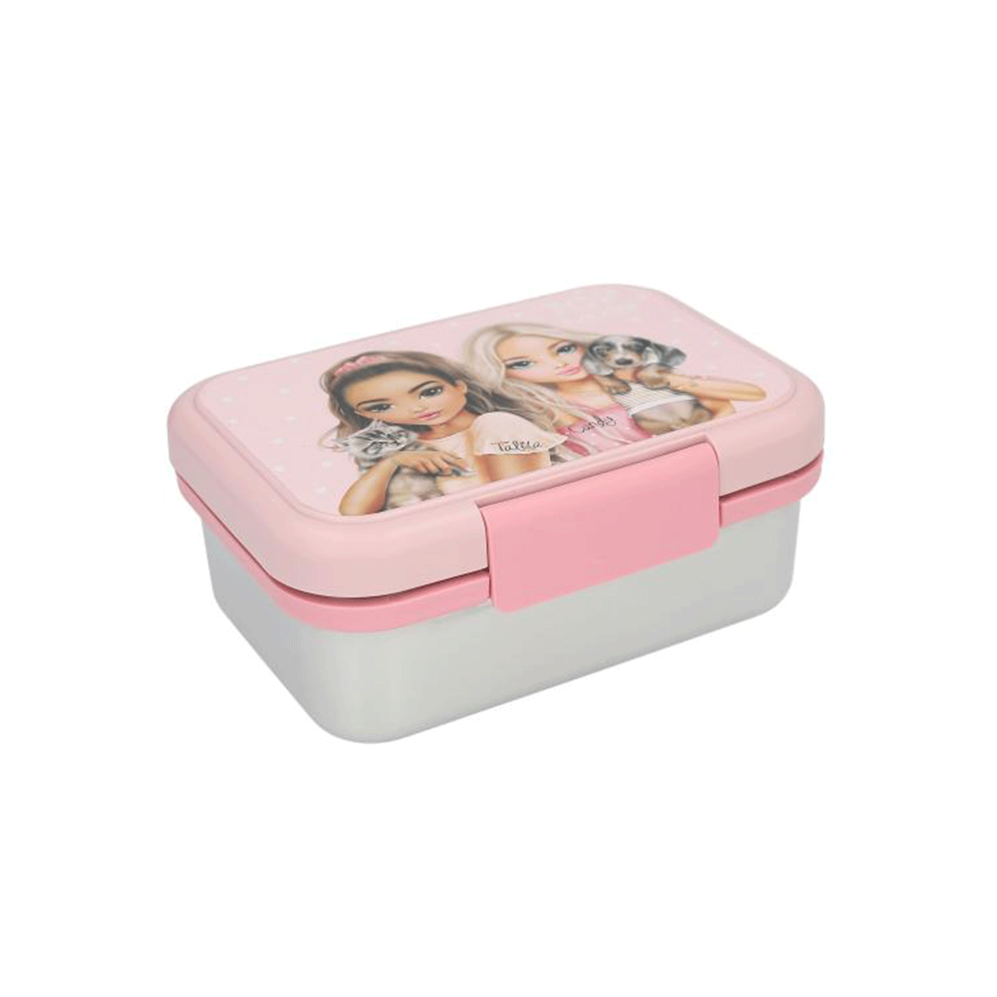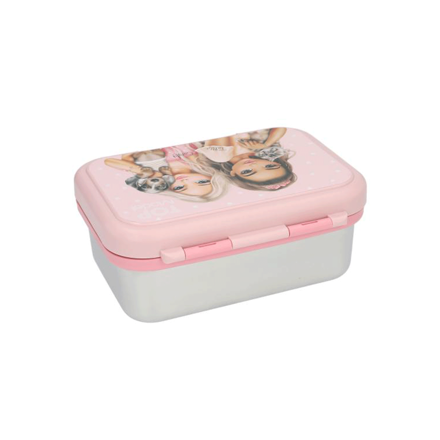 Kutija za ručak od nehrđajućeg čelika marke TOP Model ima ružičasti plastični poklopac s otisnutim motivom dvije djevojčice sa psom i mačkom. Kutija za ručak ima uklonjivu pregradu unutra. Izrađena od nelomljivog, mirisno neutralnog materijala sa silikonskim brtvom koja sprječava curenje i održava hranu svježom.
