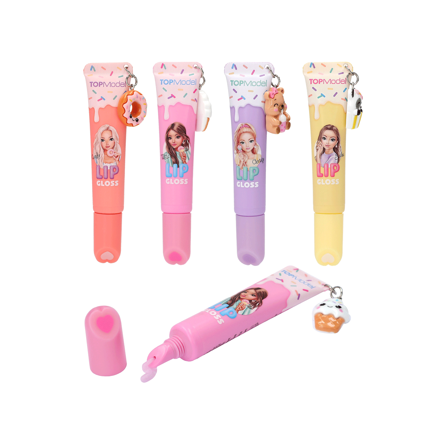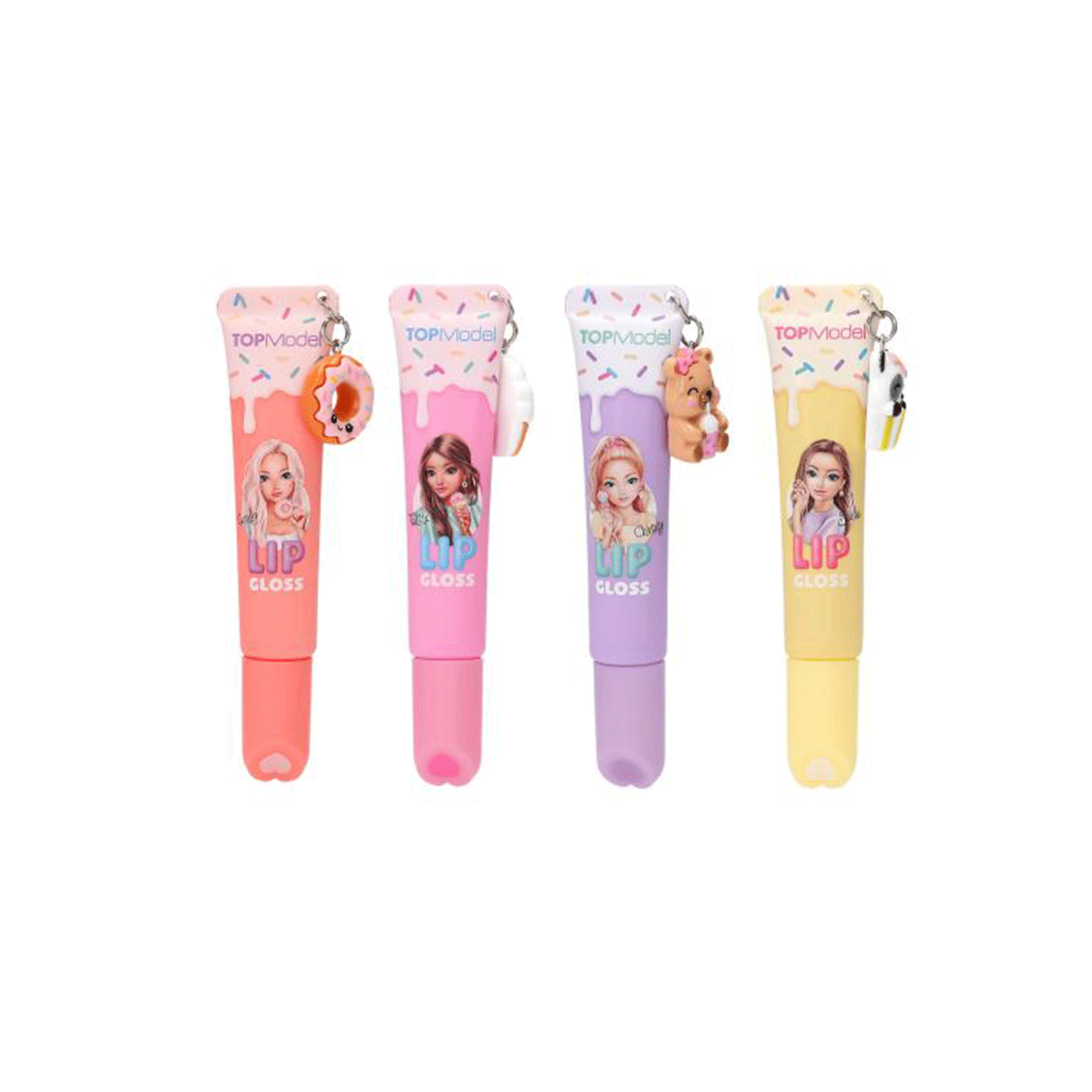 Četiri sjajila za usne marke TOPModel daju vam prekrasno svjetlucave usne. Dostupna su u boji marelice s mirisom breskve, ružičastoj s mirisom jagode, ljubičastoj s mirisom borovnice i žutoj s mirisom sljeza. Svaka tuba ima atraktivni privjesak