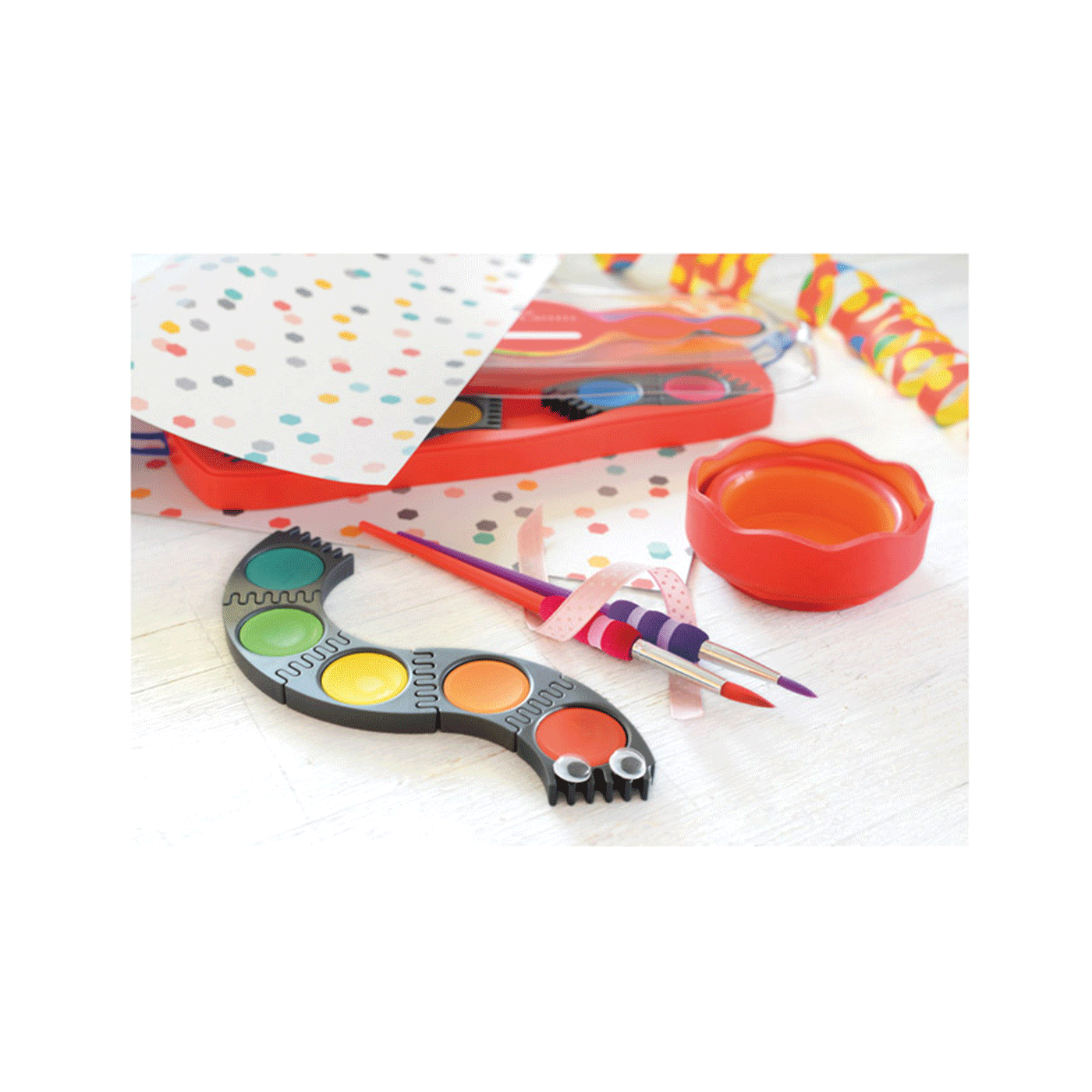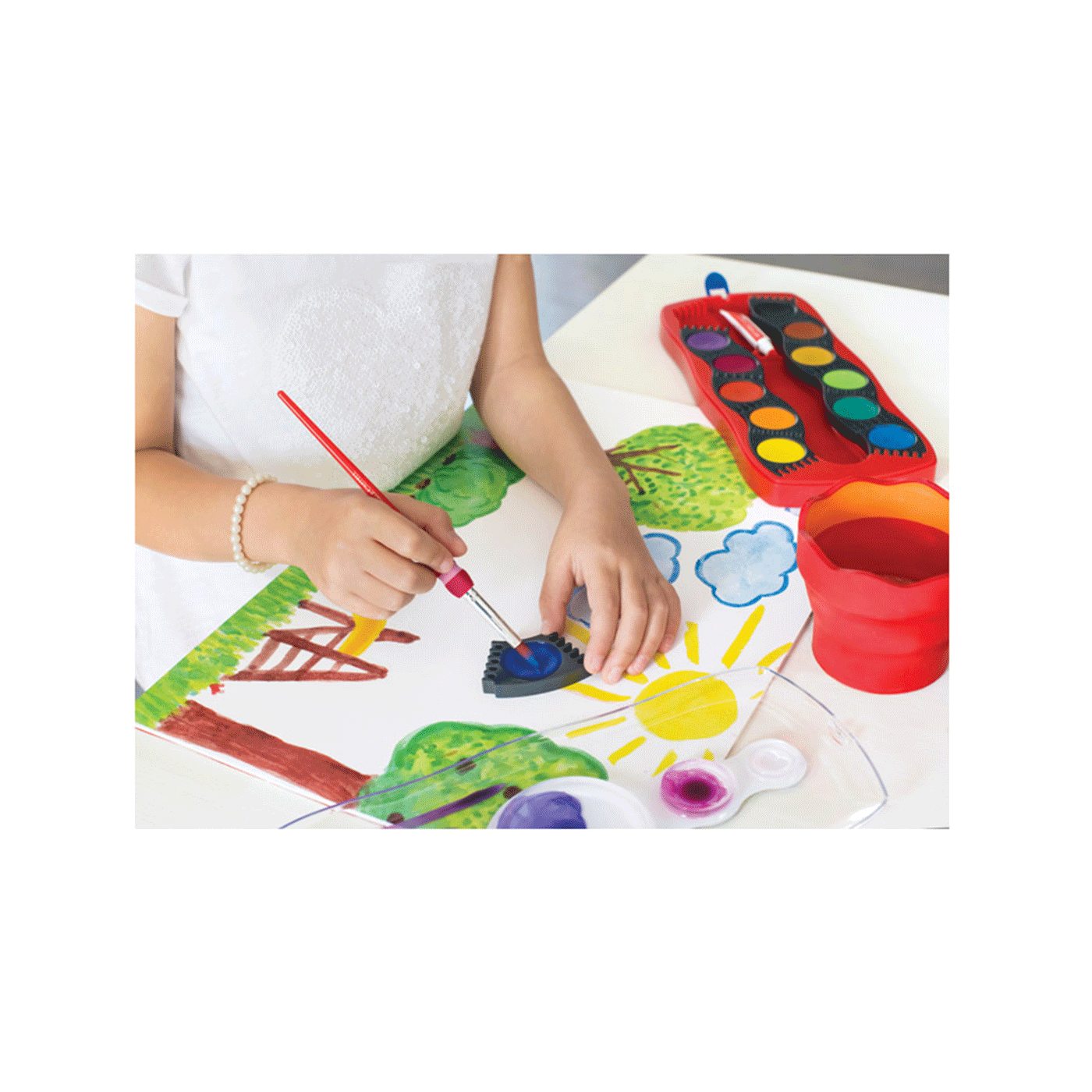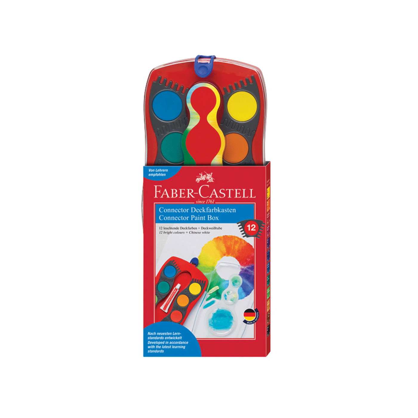 fi 24 mm; na prozirnom poklopcu je paleta sa 5 bijelih posudica; poklopac se može odvojiti i jednostavno očistiti (spaja se sa dvije kopče); na poklopcu je mjesto za upisivanje imena; svijetle boje s visokom neprozirnošću i mogućnošću pokrivanja; za različite vrste slikarskih tehnika; svaka boja je u svojoj kućici koje se mogu proizvoljno slagati u razne oblike; idealano za bojanje, slaganje i igranje; razvijeno u skladu s najnovijim standardima učenja; PVC kutija
