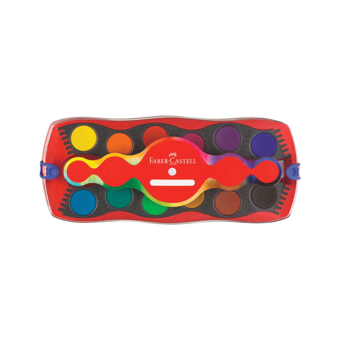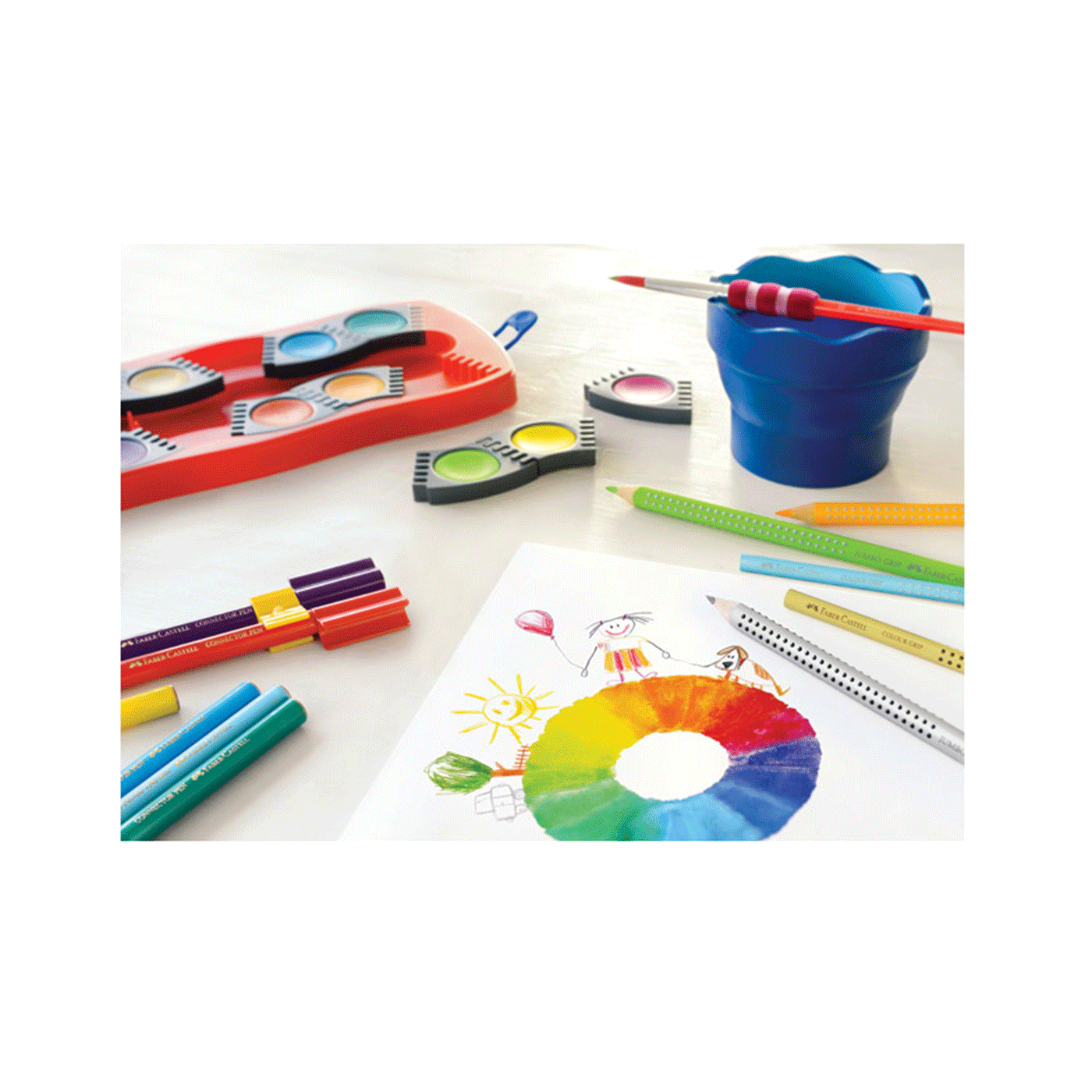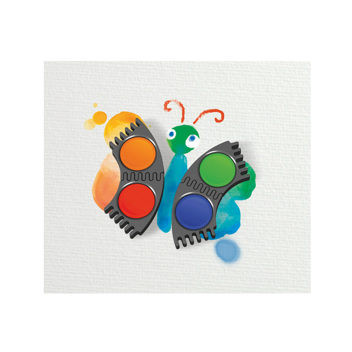 fi 24 mm; na prozirnom poklopcu je paleta sa 5 bijelih posudica; poklopac se može odvojiti i jednostavno očistiti (spaja se sa dvije kopče); na poklopcu je mjesto za upisivanje imena; svijetle boje s visokom neprozirnošću i mogućnošću pokrivanja; za različite vrste slikarskih tehnika; svaka boja je u svojoj kućici koje se mogu proizvoljno slagati u razne oblike; idealano za bojanje, slaganje i igranje; razvijeno u skladu s najnovijim standardima učenja; PVC kutija